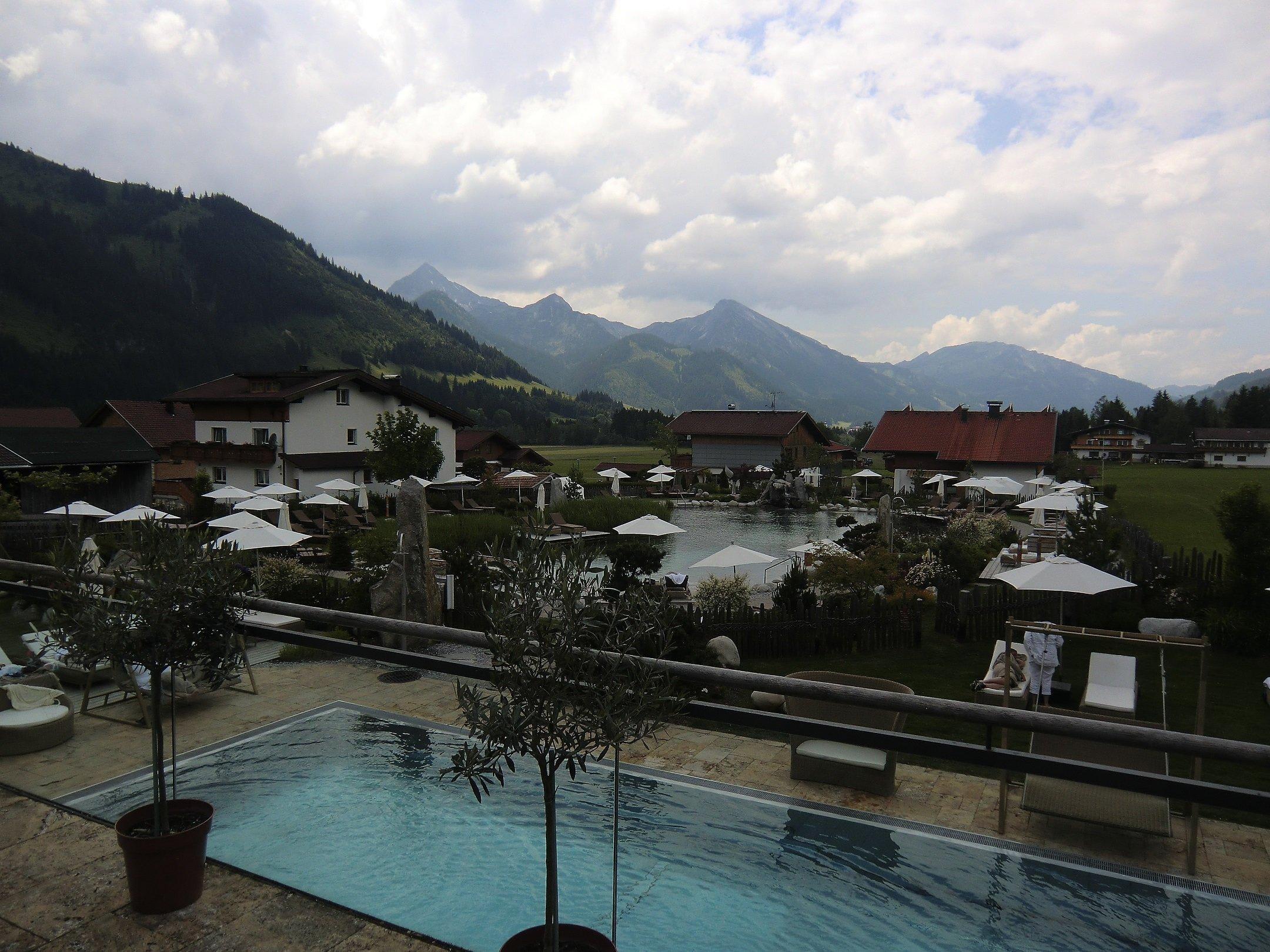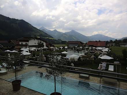 Blick auf Pool und Garten von der Sonnenterrasse