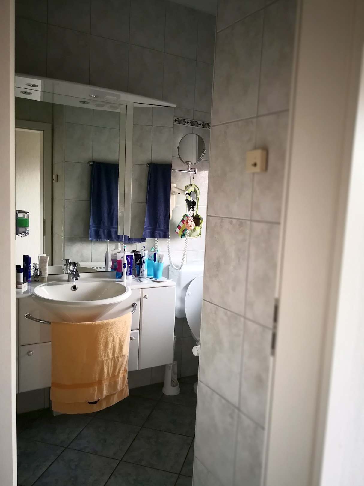 Bad mit vielen Abstellmöglichkeiten und Badschrank