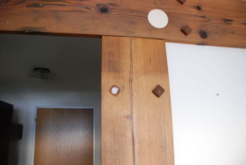 ZimmerZimmer mit Pseudo-Holzbalken, Stopfen fehlt, war mit Papier "gesichert", weil Kleber wohl fehlte.