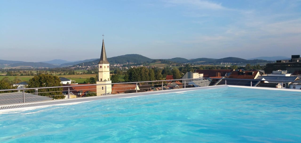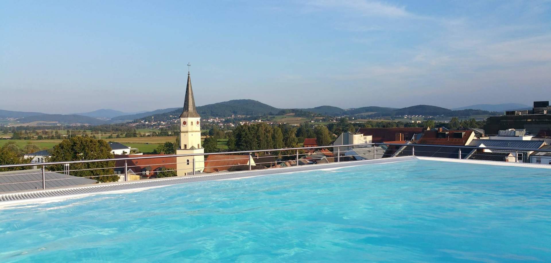 Blick über das Dach-Freibad in den Bayerwald
