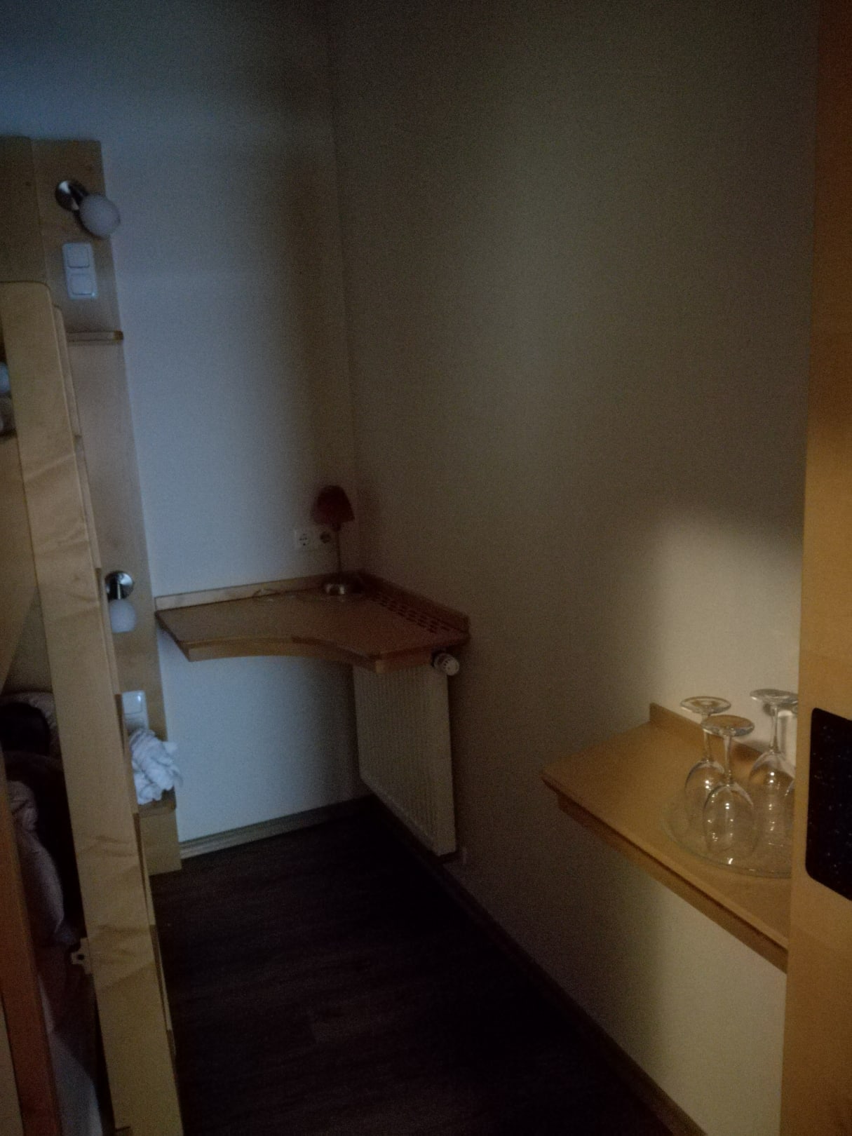 Das Kinderzimmer im Familienzimmer Geisslein. Das schmale Fenster ist halb vom Schrank verstellt. Aufnahme des Fotos bei Sonnenschein! Keine Deko, kein Bild. Lieblos bis zum Geht-nicht-mehr.