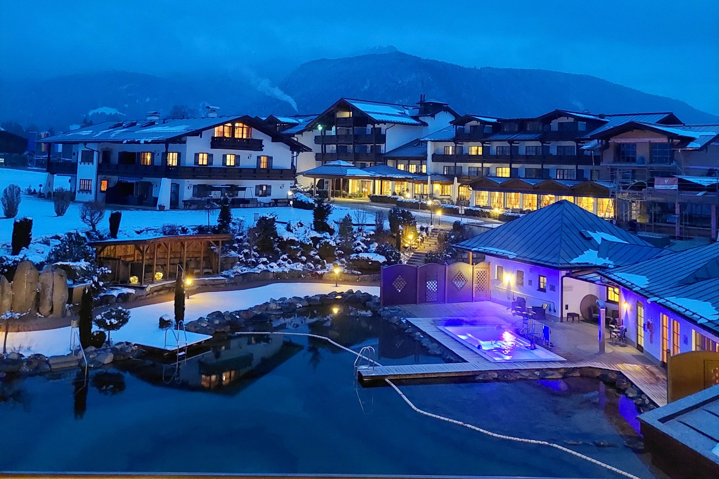 abendliche Außenansicht aufs Hotel, vom 360°C Turm im Spa-Bereich, aus "Wolke 7" fotografiert.