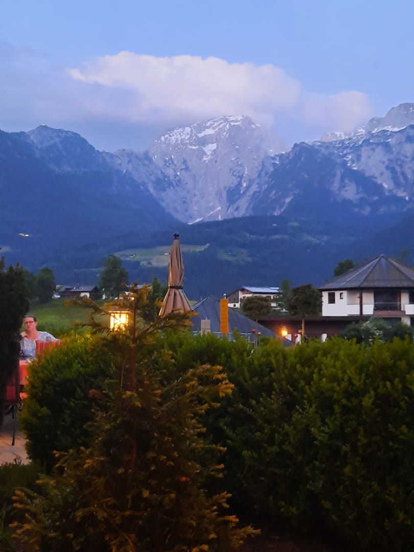 Am Abend, Ausblick über Terrasse Richtung Bergsee und Solebecken