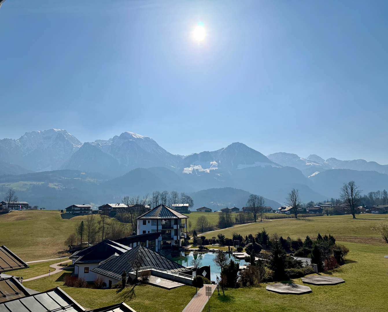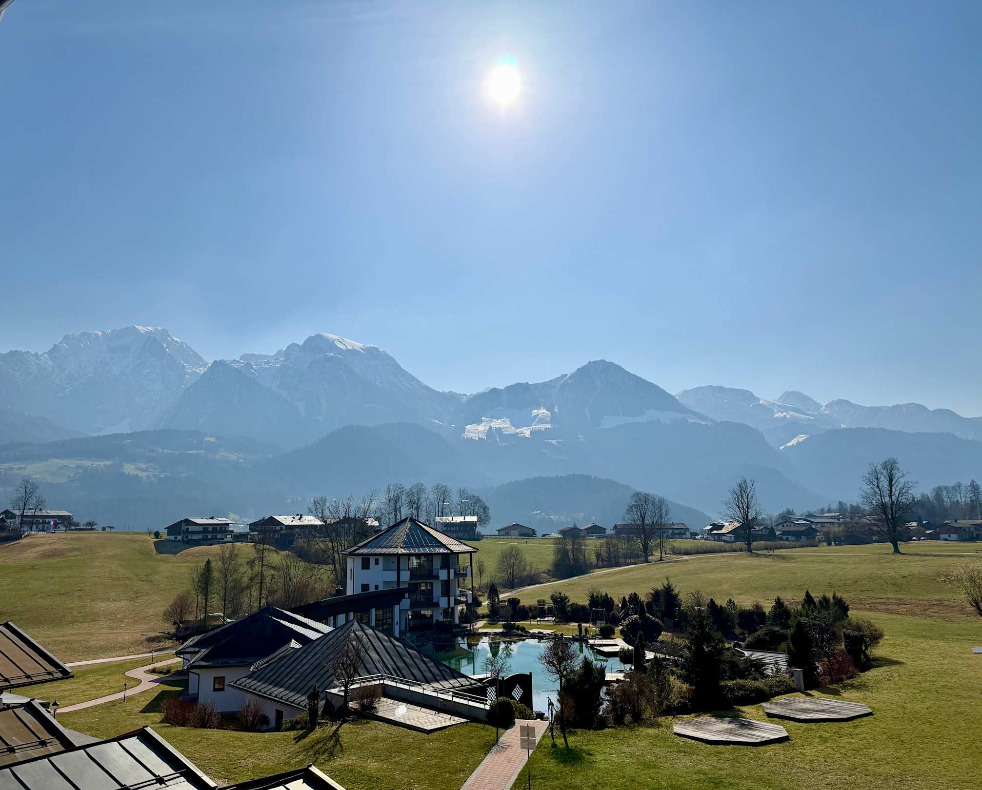Die Aussicht aus unserem Zimmer in Richtung Saunalandschaft mit Schwimmteich.