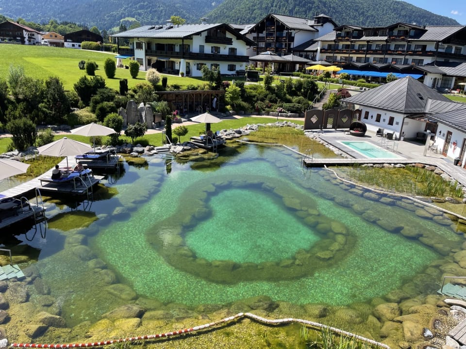 Blick von der Sauna über den Bergsee mit Blickrichtung zum Hotel, traumhaft !