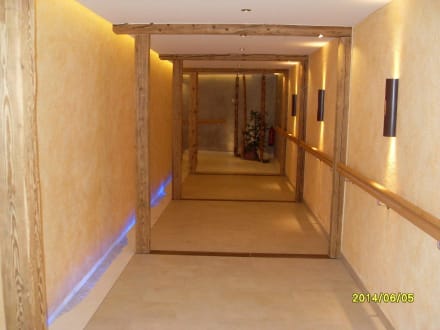 Durchgang zum Ausenpool mit Sauna
