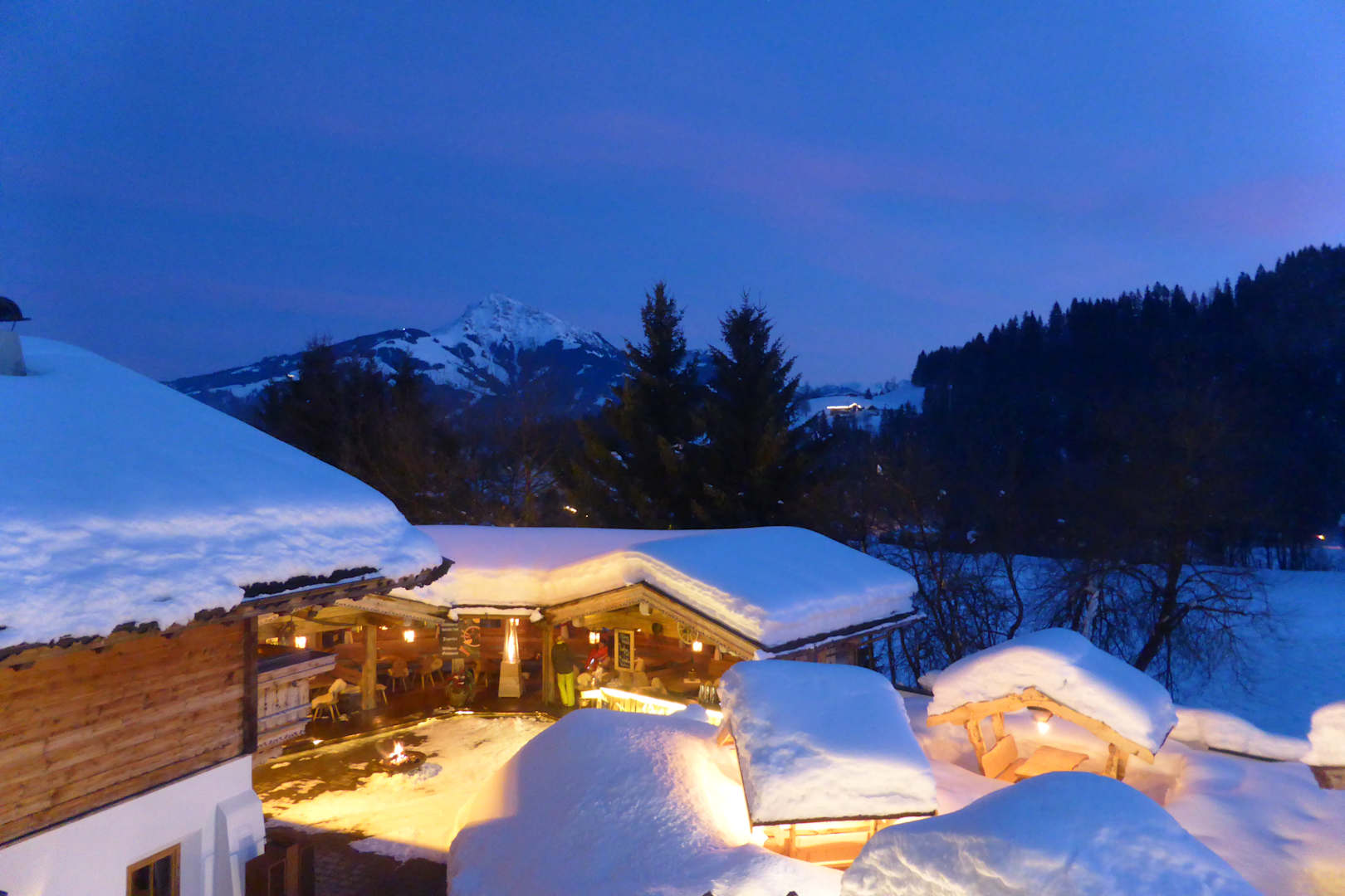 Blick vom Balkon auf das Almdörfli und das Kitzbüheler Horn