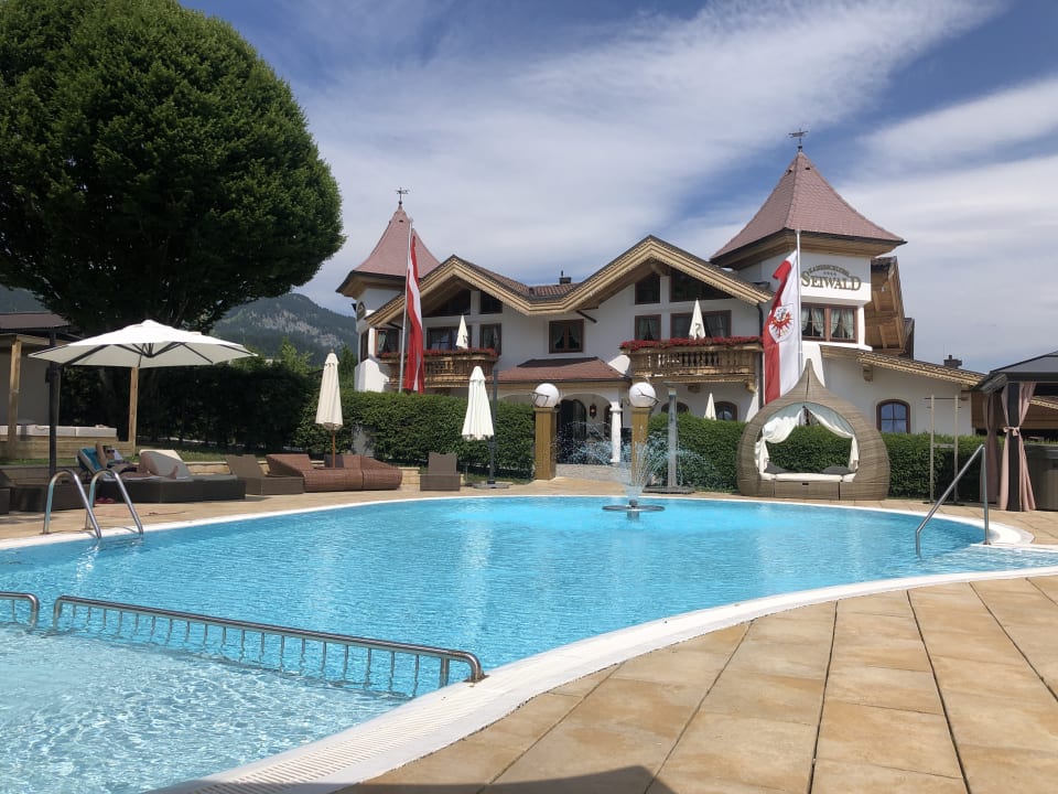 Blick auf den beheizten Aussenpool und das Alpenschlössl (Appartments).
