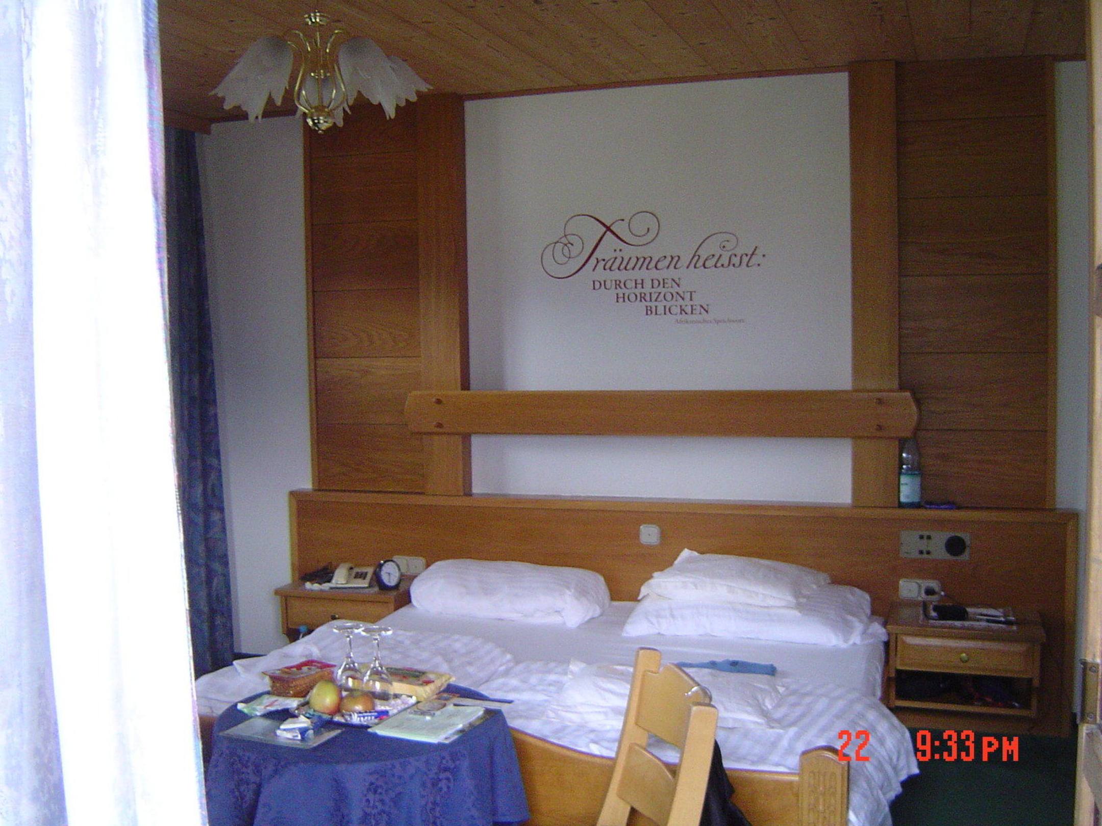 Ein Doppelbett mit einem schönen Spruch darüber