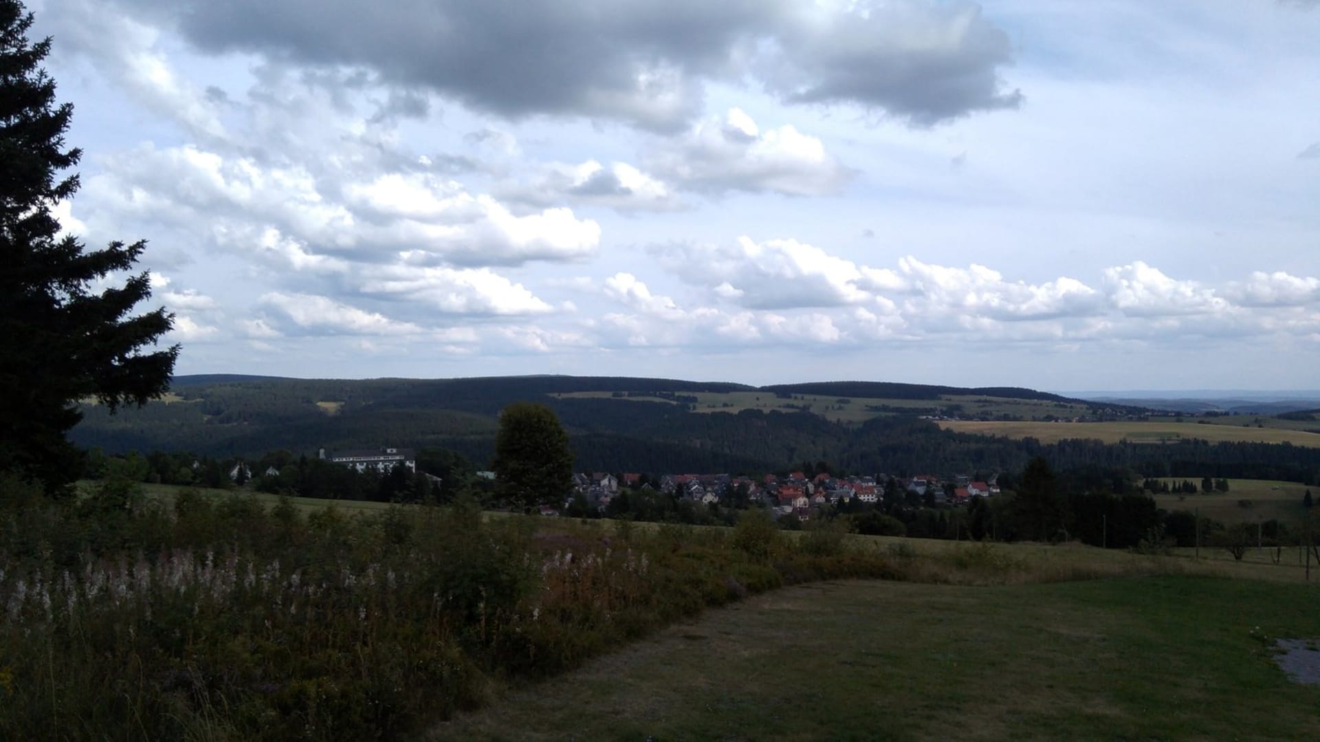 Blick vom Simmersberg auf das Dorf Schnett, das Hotel und die umliegenden Hügel