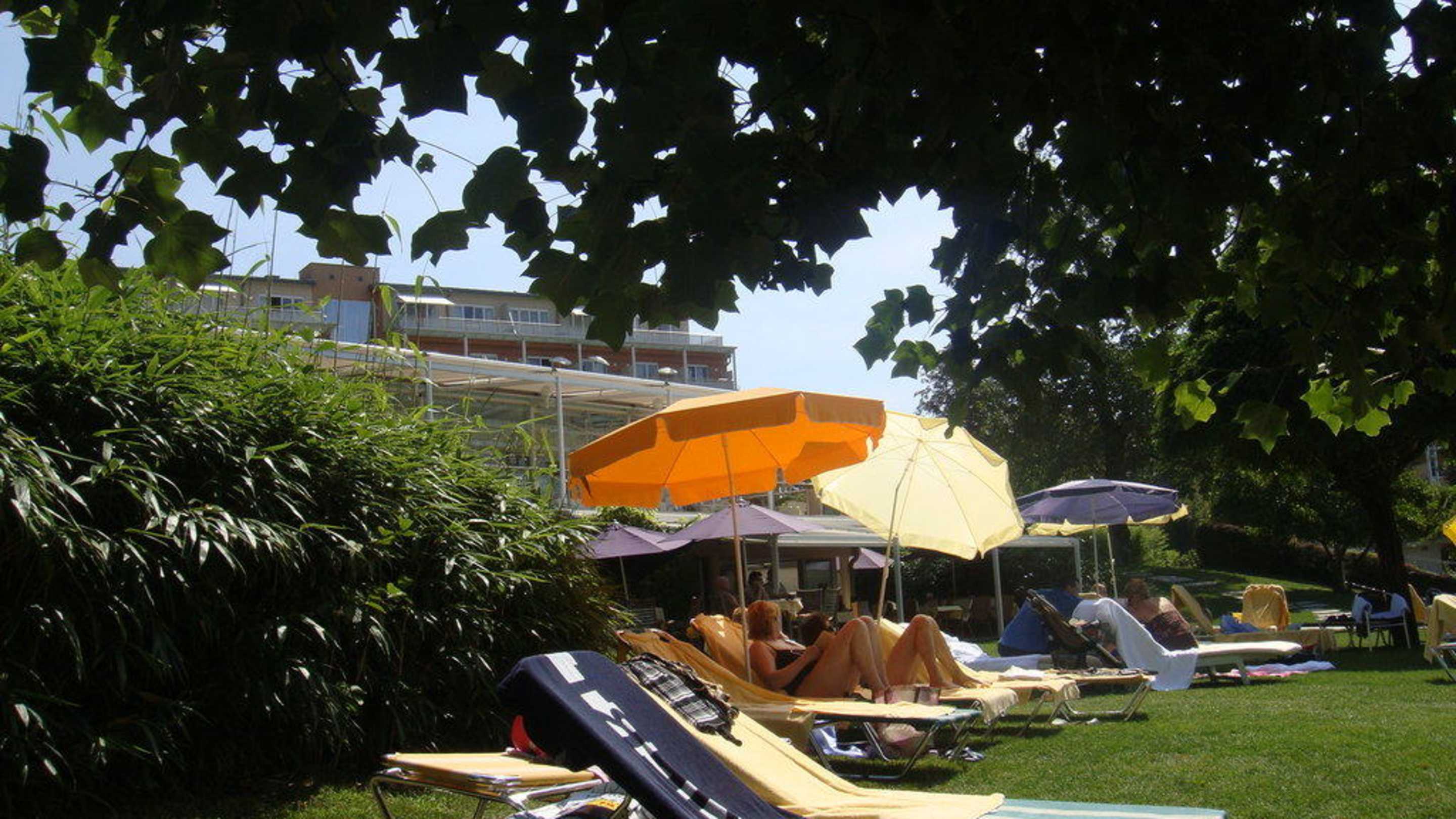 Liegewiese mit Pool und Ruheraum dahinter