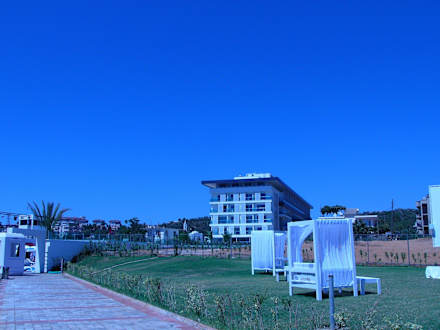 Hotel vom Strand aus, Wiese: Abends Schischa