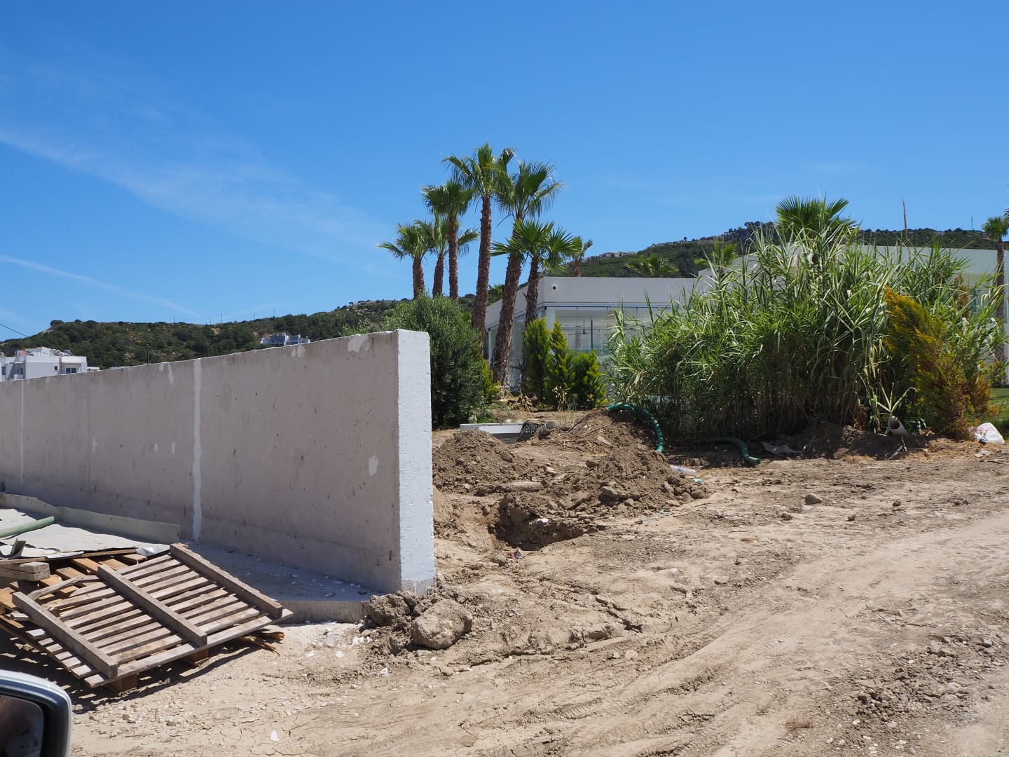 Blick auf das Geländer hinter dem Hotel sowie einer Bauzufahrt zum noch unfertigen Nebengebäude.