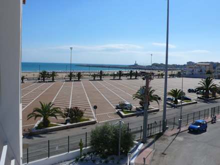 Balkonblick 2. Stock, Blick auf Parkplatz und dahinter liegendem Strand.