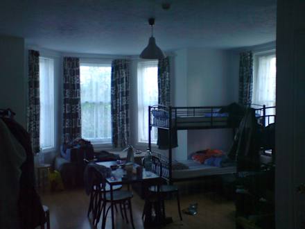 Unser Zimmer, das sich im Keller befand. Es gab acht Schlafplätze, aufgeteilt auf Etagenbetten. Der Stauraum war mau. Einen Schrank gab es nicht.