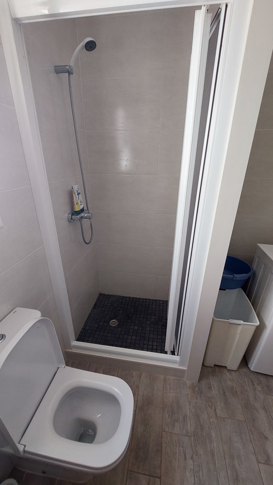 Dusche, sah auf den Fotos im Netz auch größer aus, hatte denke ich 80 x 80, also Platz genug