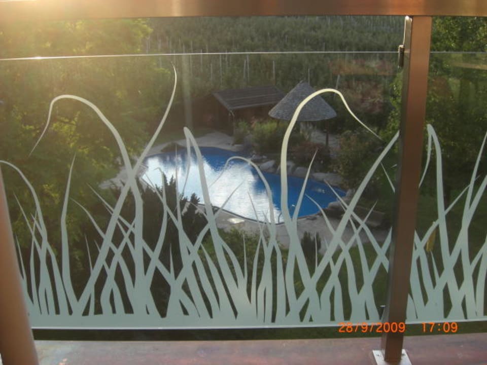 Vom Balkon durch die Glasscheibe zum Pool