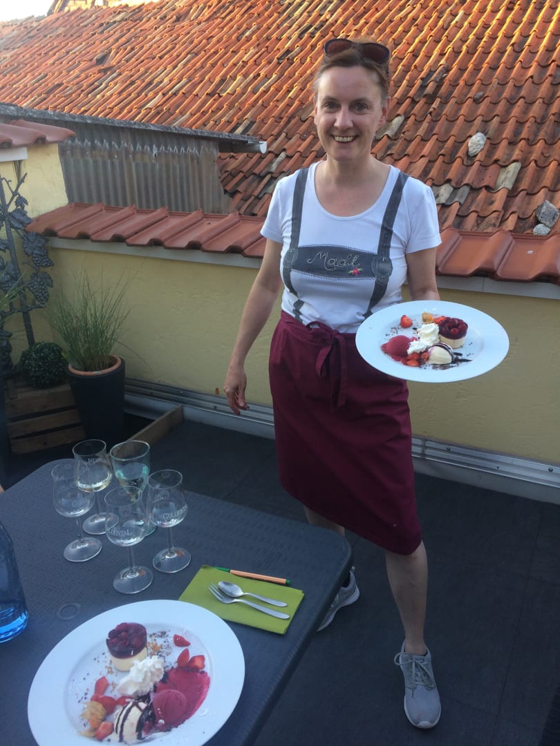 Die Chefin serviert das Dessert auf der Dachterrasse