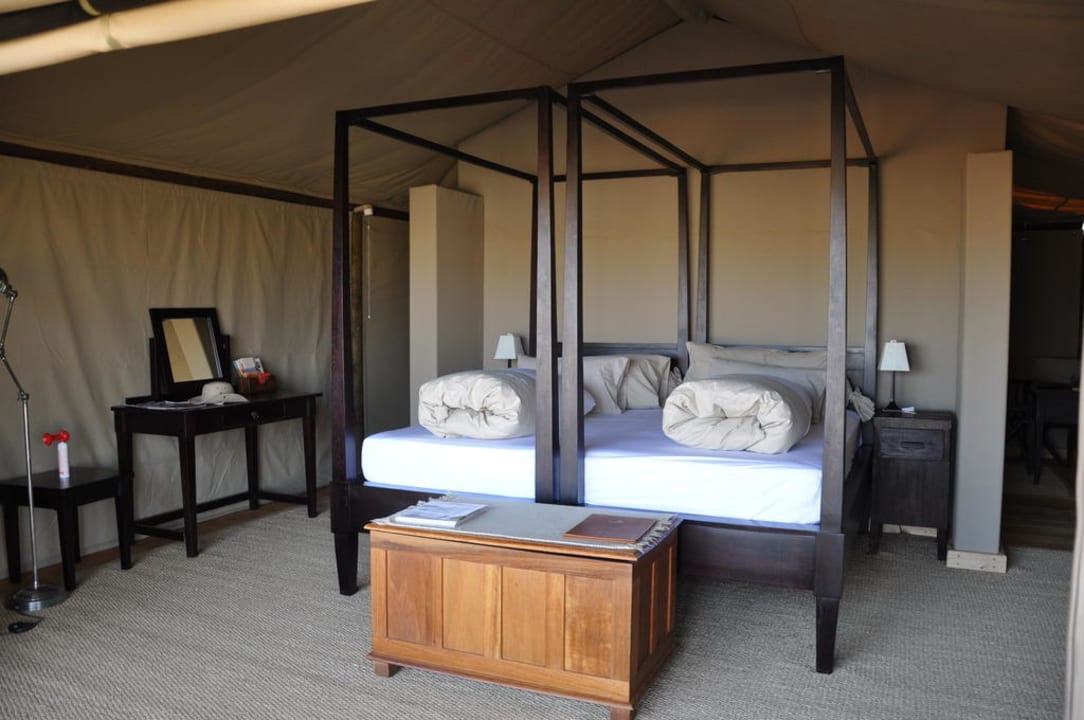Zwei bequeme Betten bilden das Zentrum des grosszügigen Zeltes. Die Moskito-Netze werden am Abend jeweils runtergelassen.