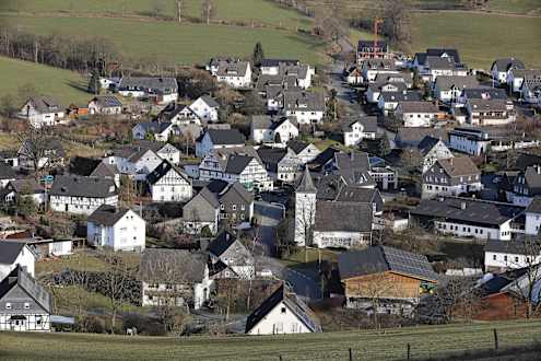 AußenansichtOberhenneborn von Süden. In der Mitte, schräg links über der Kirche der Gasthof Wüllner