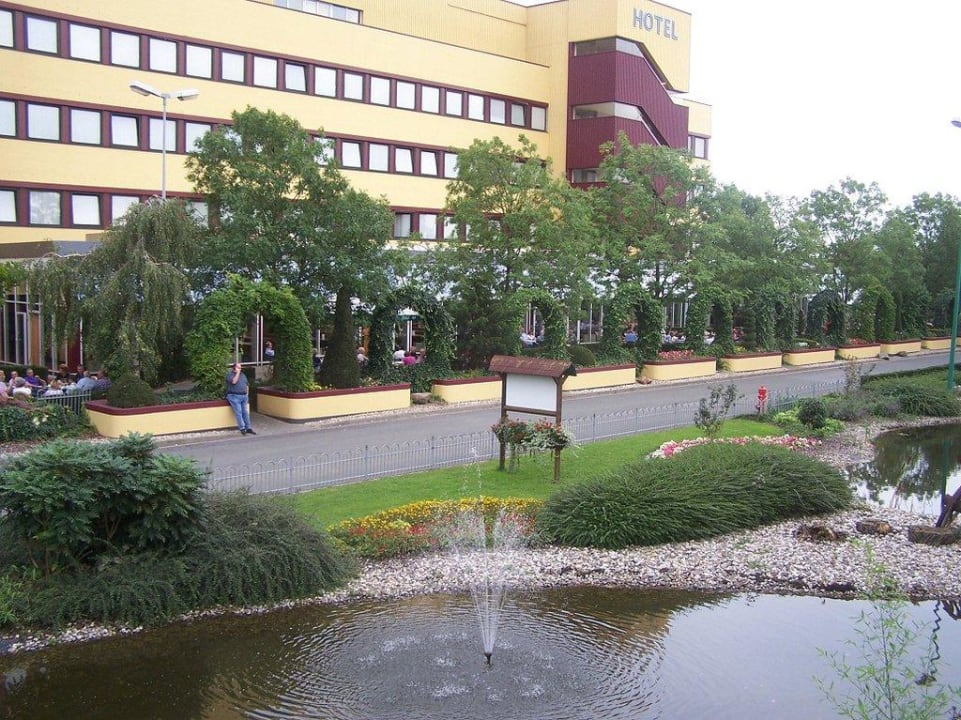Aussenanlage mit der schönen bepflanzung und Blick auf das Restaurant