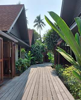 Weg zwischen den Poolvillas mit den Poolvilla Eingängen