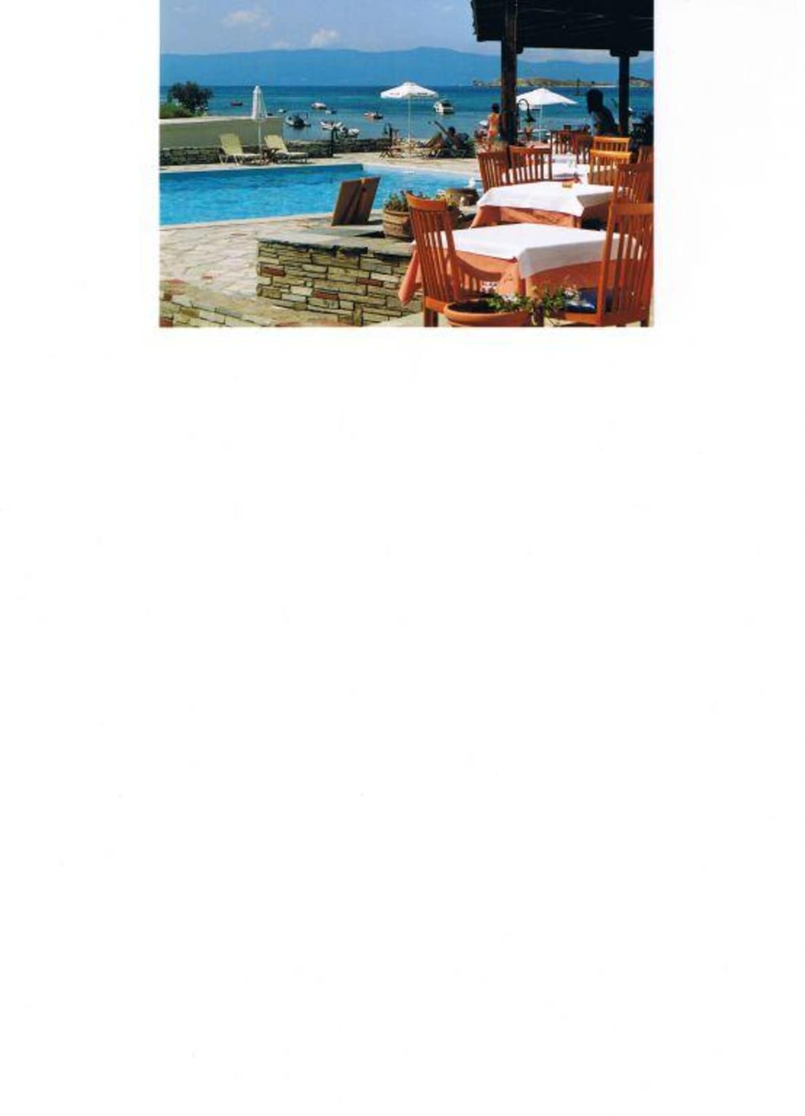 Restaurant im Freien, Pool, Meer und Sithonia im Hintergrund