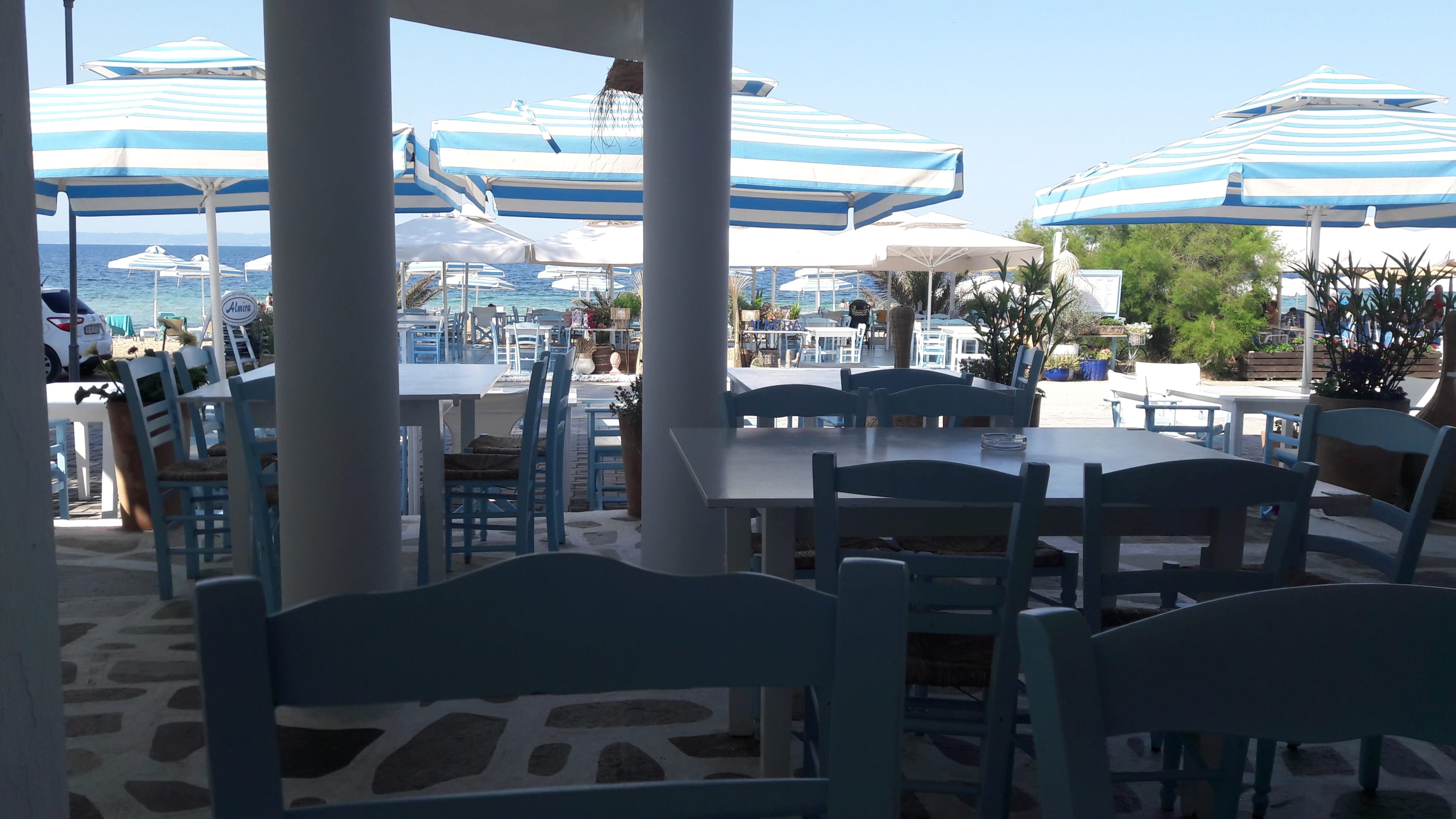 Blick von der Frühstücksterasse zum Strandrestaurant und zum Meer
