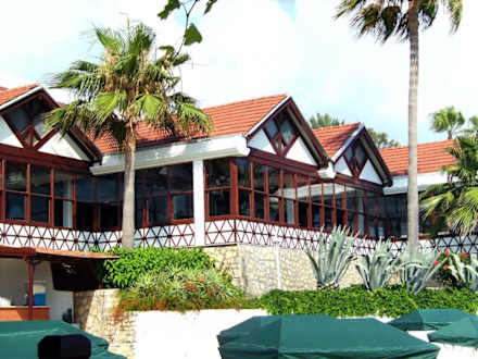 Restaurant vom Meer ausSuper Ausblick, rechts und links jeweils Möglichkeit auf Balkon draußen zu essen.