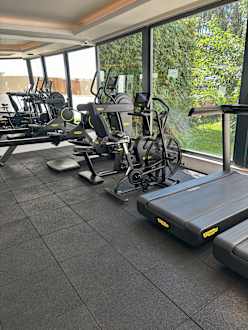 Fitnessbereich mit div Cardio Geräten.. links dann noch Kurzhanteln (bis 24 kg) und einen Turm mit Langhantel und div Kabelzügen, auch eine Holz- Box ist da