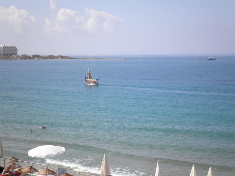 Blick von der Außenterrasse auf das ruhige klare Wasser des Mittelmeeres