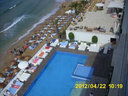 Ausblick vom Zimmer auf Pool und Strand