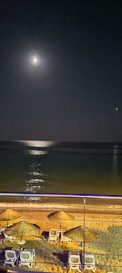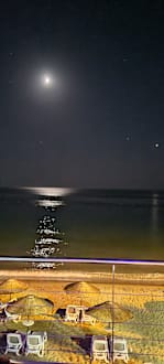 Bei Vollmond am Pool stehen und auf das Meer blicken