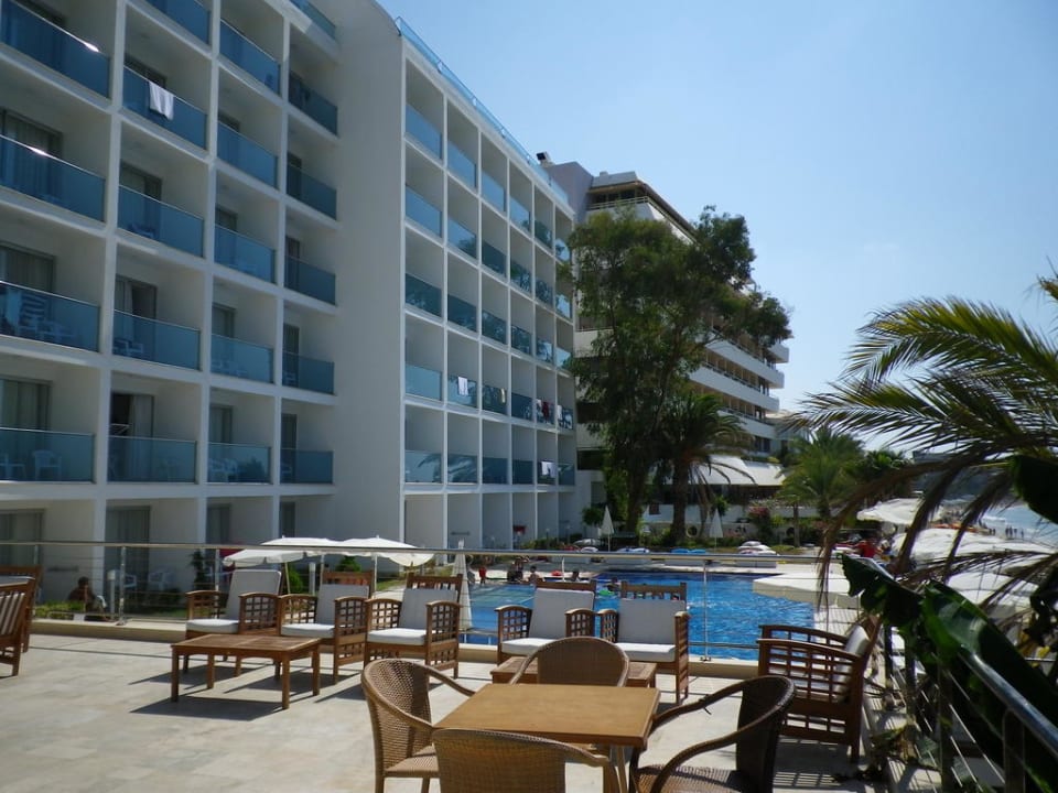 Pool von der Pool-Terrasse aus und Blick auf Hotel von hinten