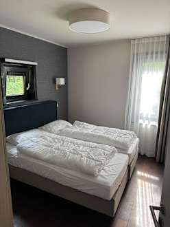 ZimmerSchlafzimmer unten mit zwei separaten Decken. Die Schlafzimmer lassen sich mit Rollos und Vorhängen gut verdunkeln.