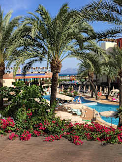 Blick vom Balkon auf Pool und Innenlage Hotel