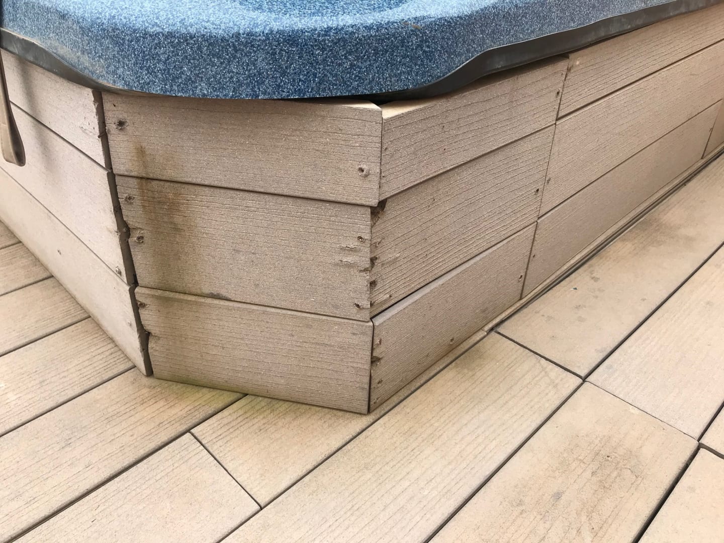 ZimmerZustand Verkleidung Whirlpool auf der Terrasse. Auch der Boden sieht entsprechend aus. Da wird nie gekärchert oder richtig geputzt.