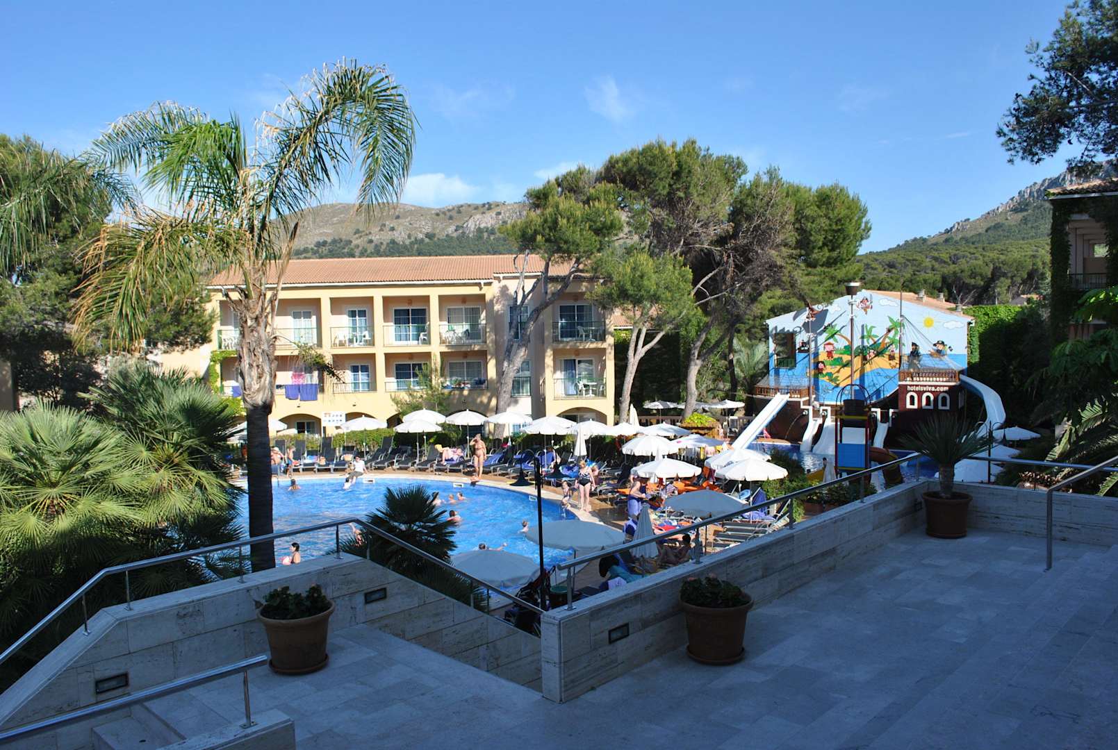 Der Blick aus dem Haupthaus zur Poollandschaft
