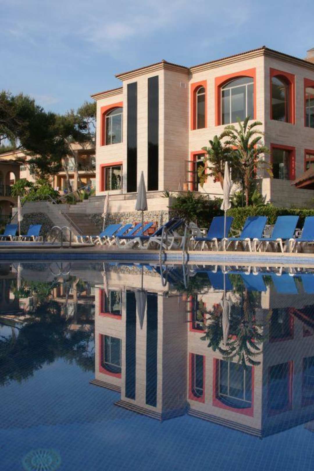 Das Hauptgebäude von der Pool-Anlage aus betrachtet. Hier befindet sich auch eines der Restaurants, in welchem Frühstück, Mittag- und Abendessen zu sich genommen wird.