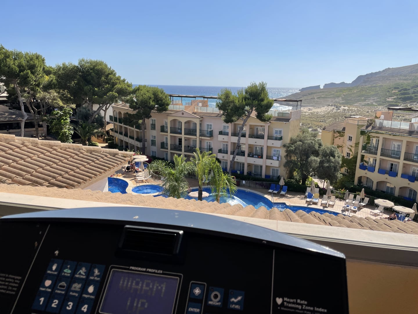 Ausblick vom Fitnessraum, mehrere Laufbänder, Crosstrainer, Hantel Bank, Matten, alles da