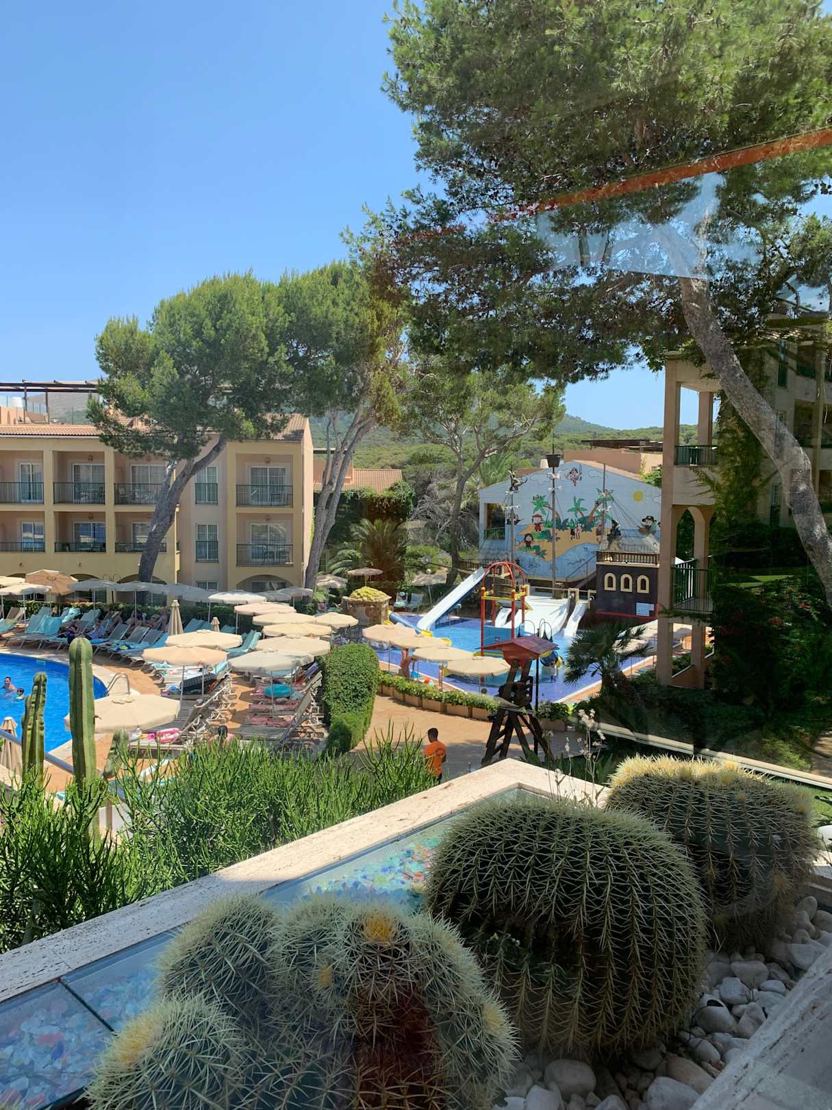 Blick von der Hotellobby zur Poolanlage