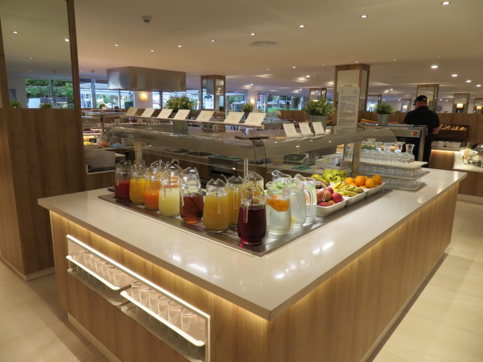 Frühstücks-Buffet mit verschiedenen Säften und Obst