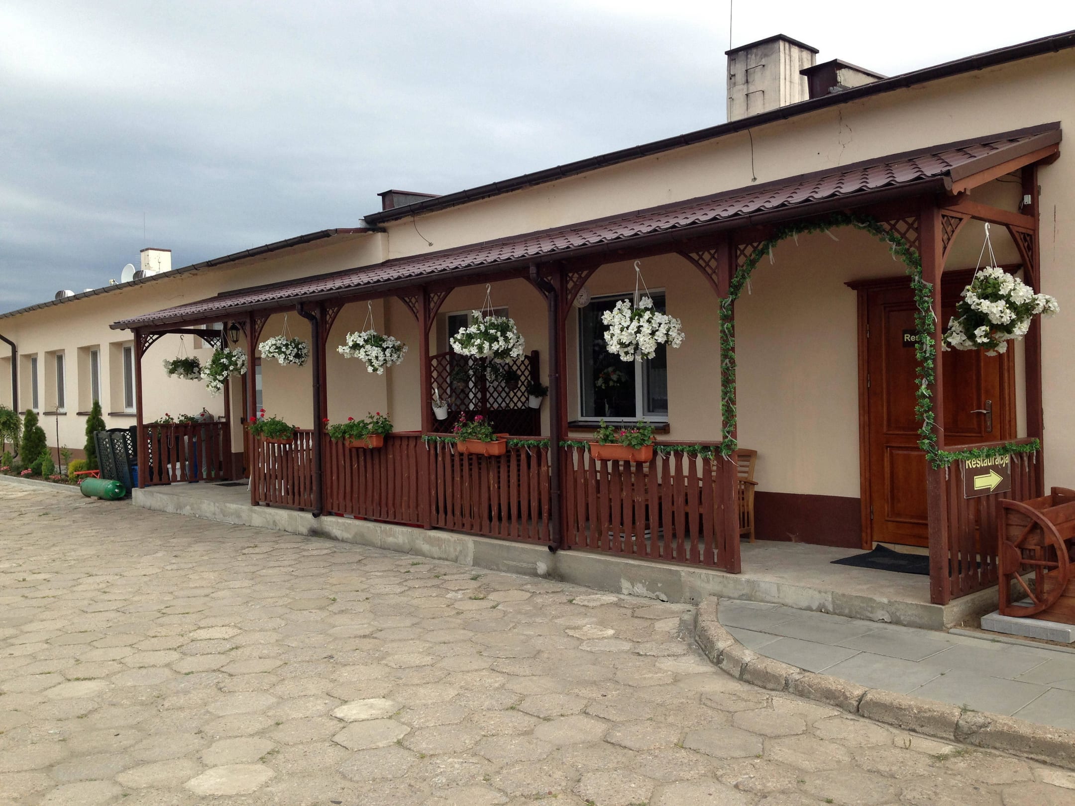 Außenbereich mit den Eingängen zum Restaurant und zur Rezeption