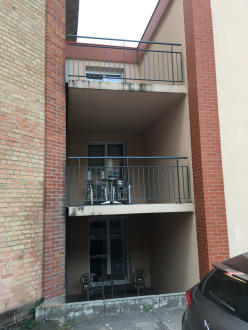 Balkon mit Ausblick auf Industrieruine.