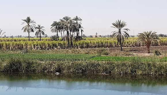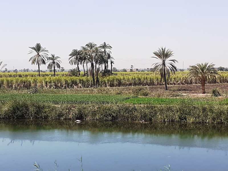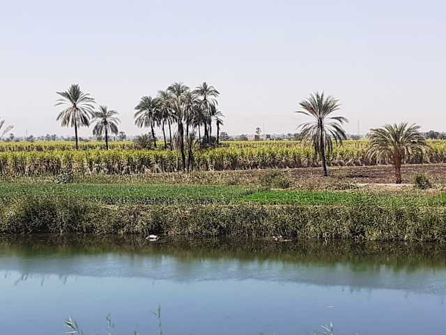 Auf der Strecke von Hurghada nach Luxor fährt man zunächst für mehrere Stunden durch karge Gebirge und unbewohnte Wüstenlandschaften, bis dann in der Nähe von Qina neben der Landstraße Bewässerungsgräben zu sehen sind, die das Nilwasser zu den Gemüse-, Getreide- und Zuckerrohr-Feldern bringen. Dieser krasse Unterschied im Landschaftsbild verdeutlicht die Bedeutung des Flusses für das Leben der Menschen.