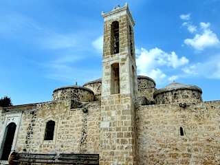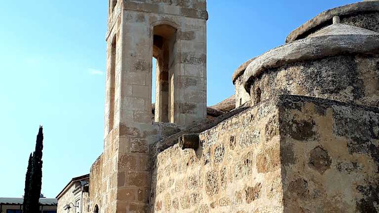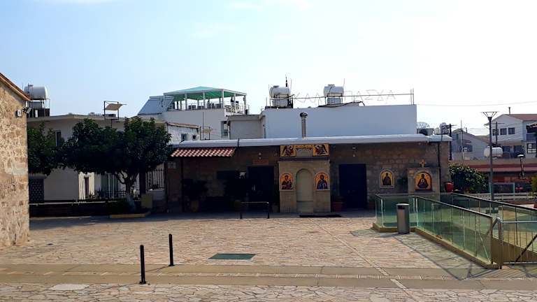 AgiaParaskevi in Geroskipou, close to Paphos, there lies the small church builtpresumably in the 9-th century with her 5 domes. It is a wonderful church from the Byzantine time with marvellous mural paintings and icons. A silver icon isconsecrated of the holy Paraskevi. Unfortunately, the church is only seldomopened and taking a photo is forbade in the interior. The Keyholder, so theoverseer is called, has an alert look at the visitors. Geroskipouis also known for his Turkish sweets in the place are offered.