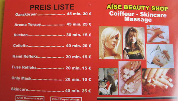 • Habe diesen Tipp als Empf. erhalten und auch getestet und es wäre schade wenn man solche Adresse nicht weiter geben würde, denn die Betreuung ist Herzlich schön und findet im guten deutsch oder engl. statt, der Haarschnitt super und Fönfrisuren halten auch länger, Massagen sehr zu empf. Fachliches Wissen wird hier ausgeübt zu fairen Preisen was aber nicht heißt das es Billige abzocke ist. Bin mit Rückenbeschwerden hingegangen (gekrochen)und nach ca 60 min Ganzkörpermassage inkl. Druckpunktmassage und Wärmebehandlung fast schmerzfrei nach der ersten Behandlung ("25,€) glücklich und zufrieden wieder in mein Hotel (SaturnPalaceResort) zurückgegangen, ich freue mich auch schon auf meinen 2´ten Termin den ich auch gleich fest gebucht habe. Ich lege Wert auf die saubere Qualität und nicht auf Quantität in der Werbung. AISE finde ihr gegenüber dem Hotel RoyalWings dieser kl. SHOP hält was er verspricht.