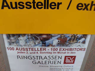 An jedem 2. und 4. Sonntag im Monat von 10 bis 17 in den Ringstrassen Galerien ( direkt neben der Staatsoper --> 1010 Wien Kärntnerring 5-7 ) - Zeitreise Antikmarkt - Freier Eintritt - der größe regelmäßige Antikmark in Österreich mit mehr als 100 Ausstellen. Porzellan, Bilder, Uhren, Gemälde, Grafiken, Schmuck, Miniaturen, Ratitäten, Biedermeier, Jugendsil, Art Deco - 50&60er Jahre Design etc.Bücher und Schallplattenböre im Obergeschoss. Die nächsten Termine für 2011: 13.03., 27.03., 10.04., 24.04., 08.05., 22.05., 12.06., 26.06. 2011 usw.