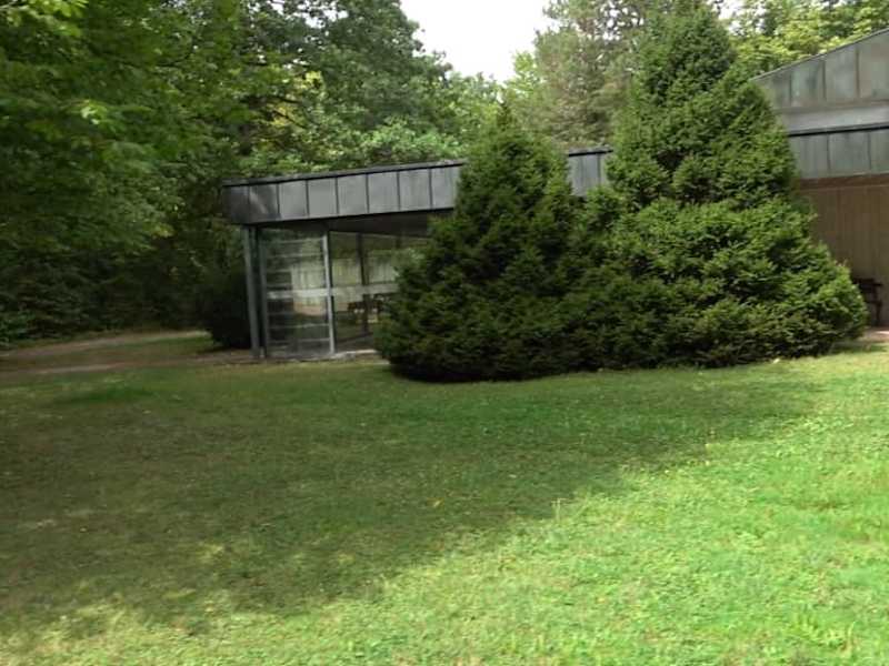 Die Aussegnungshalle auf dem Waldfriedhof ist sehr modern gestaltet. Viel Holz, Stahl und Glas ist zu sehen. Sie befindet sich direkt beim Eingang. Ein Ort zur Ruhe und besinnlichen Gestaltung.
