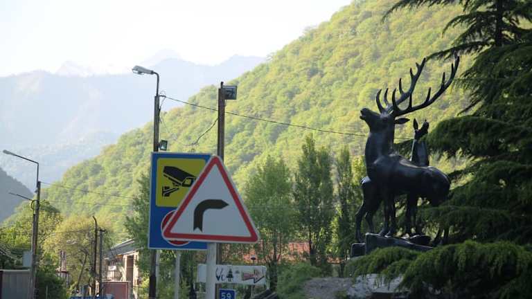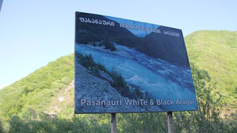 Etwa 30 km Fahrt von Ananuri entfernt, machten wir einen kurzen Stopp bei der kleinen Ortschaft Passanauri. Diese Aussichtsstelle an der Georgischen Heerstraße war mit einer Hinweistafel gekennzeichnet. Auf der Tafel ist vermerkt „ Pasanauri White & Black Aravi „. Neben dieser Aussichtsstelle befindet sich ein Kiosk und 2 Hirsch-Statuen. Die Ortschaft Passanauri liegt in einer kleinen Talweitung und ist von 2600 bis 2800 Meter hohen Bergen des Großen Kaukasus umrahmt. Passanauri ist bekannt für seine malerische Landschaft und die Nähe zu historischen Orten. In der früheren Sowjetunion war Passanauri als Touristenort bekannt, verarmte jedoch nach deren Zerfall. Im Jahr 2002 hatte das Dorf nur noch1600 Einwohner. Unsere Reiseleiterin erzählte uns, dass es in Passanauri möglich ist, eine Rafting tour zu machen. Wir können das jedoch nicht bestätigen. Bei Passanauri fließen der Weiße oder Mtiuleti-Aragwi und der Schwarze oder Gudamaqri-Aragwi zum Aragwi (bzw. auch Aragvi genannt) zusammen, einem linken Nebenfluss der Kura (Mtkwari). Der Weiße Aragwi entspringt in ca. 3.000 m Höhe wenige Kilometer von Dshwari-Pass entfernt. Der Schwarze Aragwi ist der längere der beiden Quellflüsse, er entspringt weiter östlich im Kaukasus. Seine Quelle liegt in einer Höhe von 2.865 m auf der südlichen Abdachung des Hauptkamms des Großen Kaukasus. Der Schwarze Aragwi ist 56 km lang, womit sich eine gesamte Länge des Aragwi von 112 km ergibt. Man sieht sehr deutlich den Unterschied in den Farben der Flüsse. Manche Leute vergleichen es mit Yin und Yang. Nach einiger Zeit vermischt sich der Fluss allmählich und wird zu einer Farbe. Die Mündung des Aragwi in den Mtkwari bei Mzcheta ist historisch, kulturell, kirchlich und touristisch ein wichtiger Ort für Georgien. Die frühere georgische Hauptstadt Mzcheta liegt westlich der Mündung. Auf der anderen Seite des Fluss liegt das Dshwari-Kloster (Kreuzkloster) auf einem Bergsporn rund 150 m oberhalb des Flusses. Entlang des Flusses verläuft mit der Autobahn S-1 eine der wichtigsten Straßen in Georgien. Es lohnt sich, eine kurze Pause bei dieser gut gekennzeichneten Aussichtsstelle neben dem Zusammenfluss der Weißen und Schwarzen Aragvi zu machen.